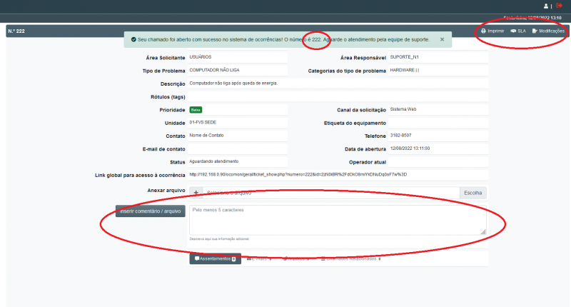 5 - Você verá a tela de confirmação mostrando o numero da ocorrência no sistema, nesta mesma tela você pode inserir comentários adicionais.