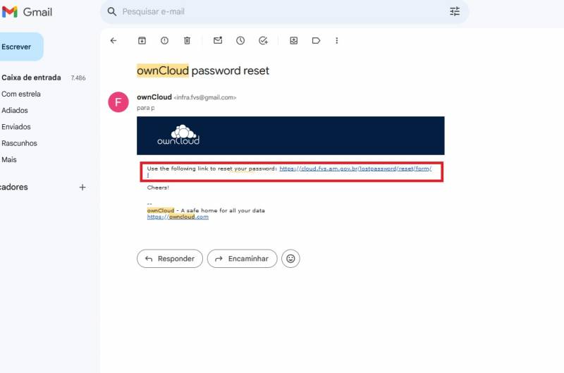4 - Abra seu E-mail e procure uma mensagem proveniente de infra.fvs@gmail.com (procure na pasta SPAM caso não encontre na caixa de entrada)